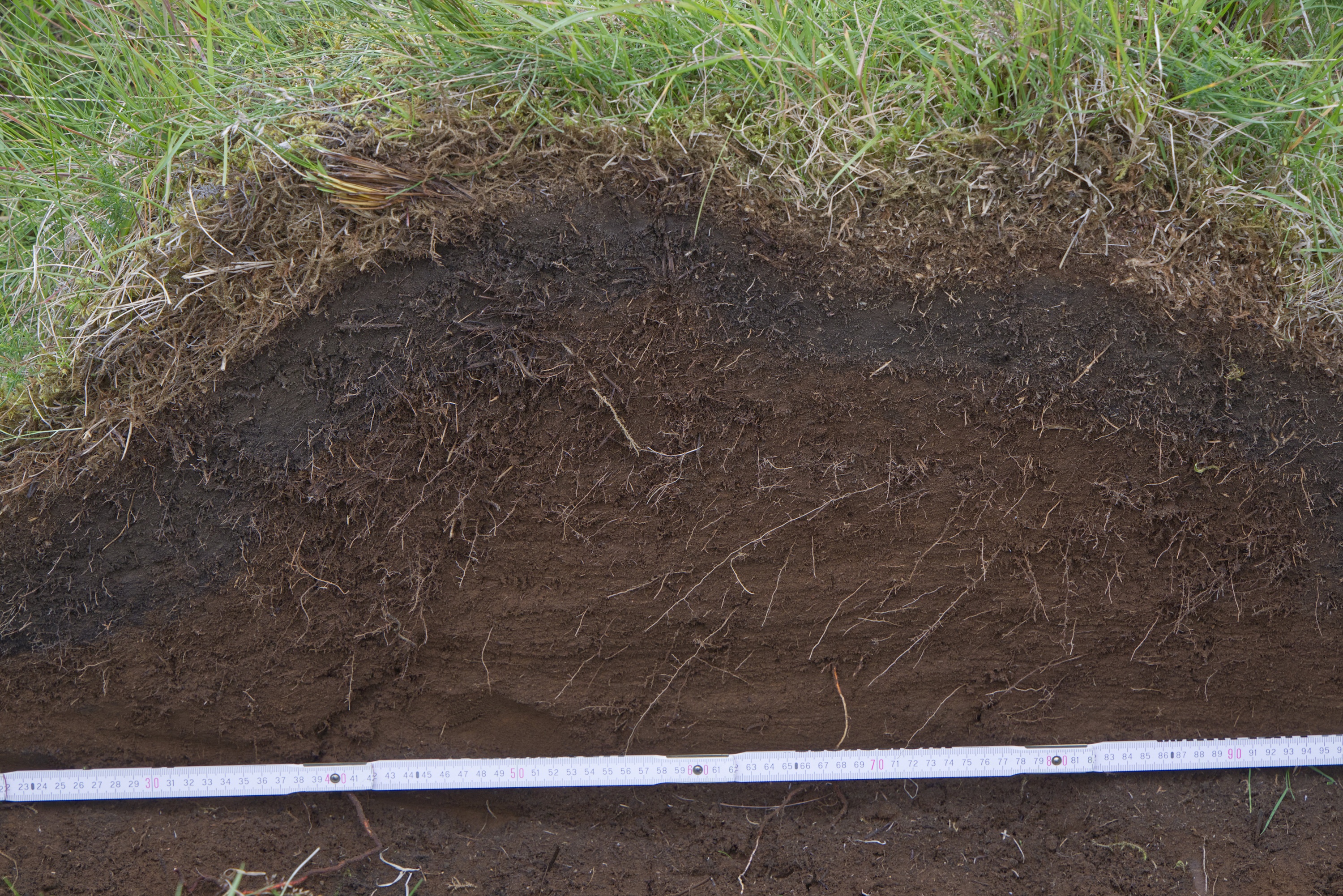 First image is of the Landnám (Settlement Layer) which is composed of tephra from eruptions of Torfajökull (white) and Veiðivotn (olive green). The second image is of the tephra from the 2010 eruption of Eyjafjallajökull a year after the eruption, forming a distinct layer below the vegetation.