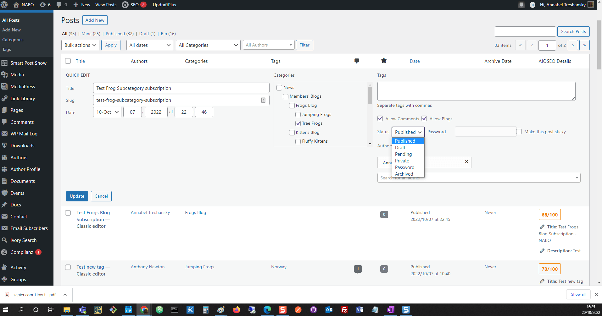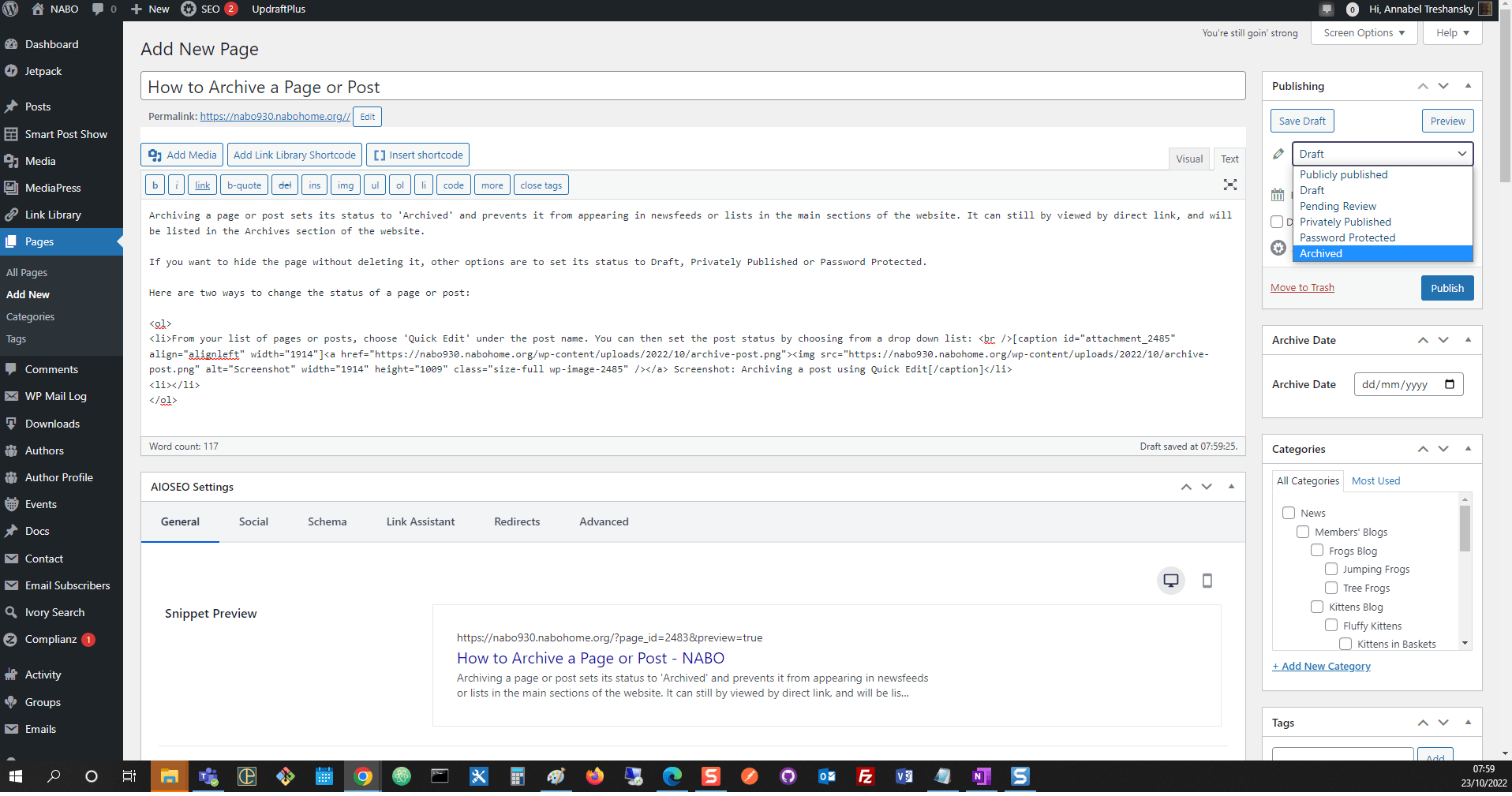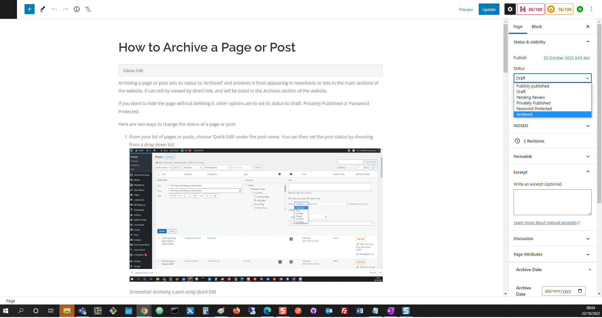 Screenshot: Archiving a post using Quick Edit - Within the classic editor, you can set the post status from a drop down list in the ‘Publishing’ box: